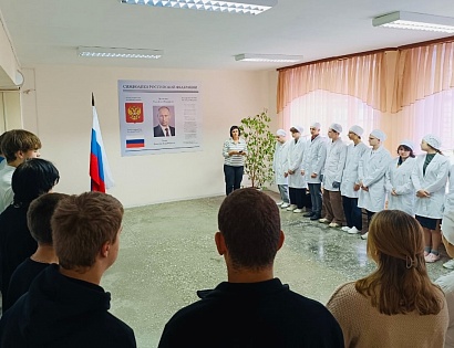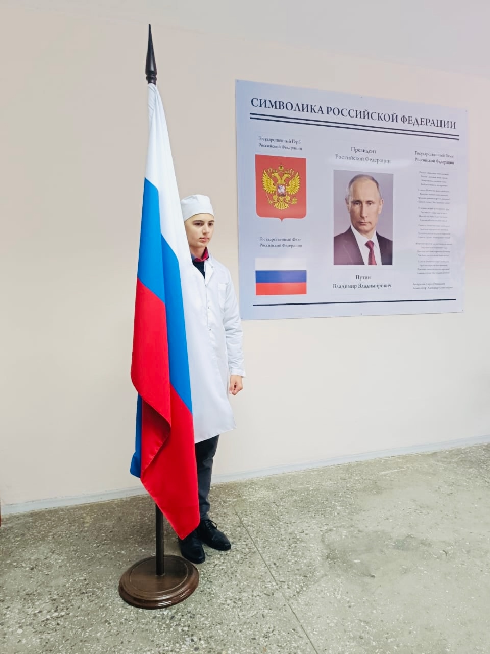 Право поднятия Государственного флага Российской Федерации — символа единства и достоинства страны — было предоставлено студенту 1 курса специальности «Лечебное дело» Артему Башилову.