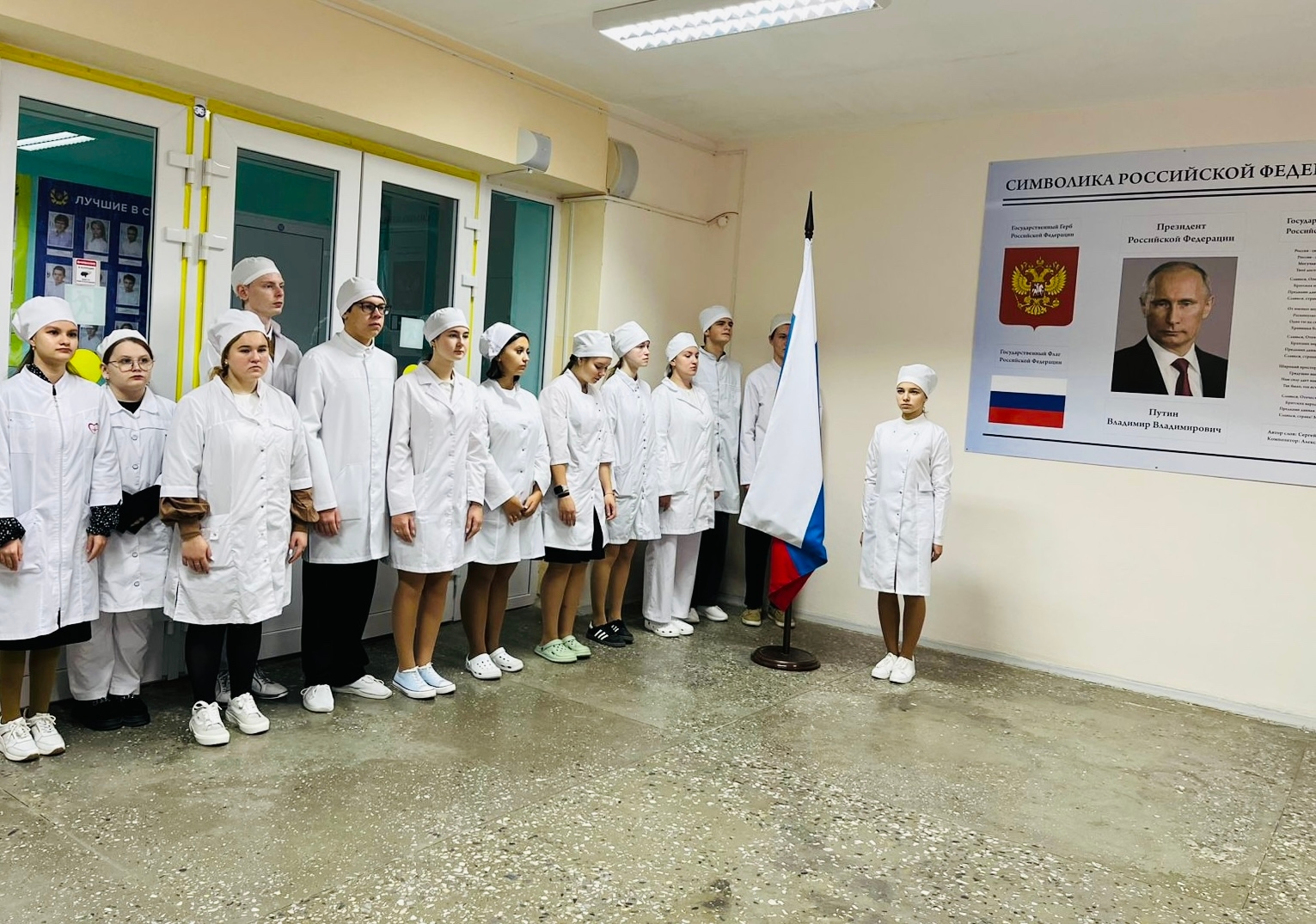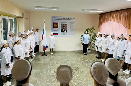 Мероприятие открылось торжественным выносом Государственного флага Российской Федерации — символа национального единства, чести и достоинства. Почетное право вынести флаг было предоставлено студентке 1 курса специальности «Сестринское дело» Арине Блажновой.