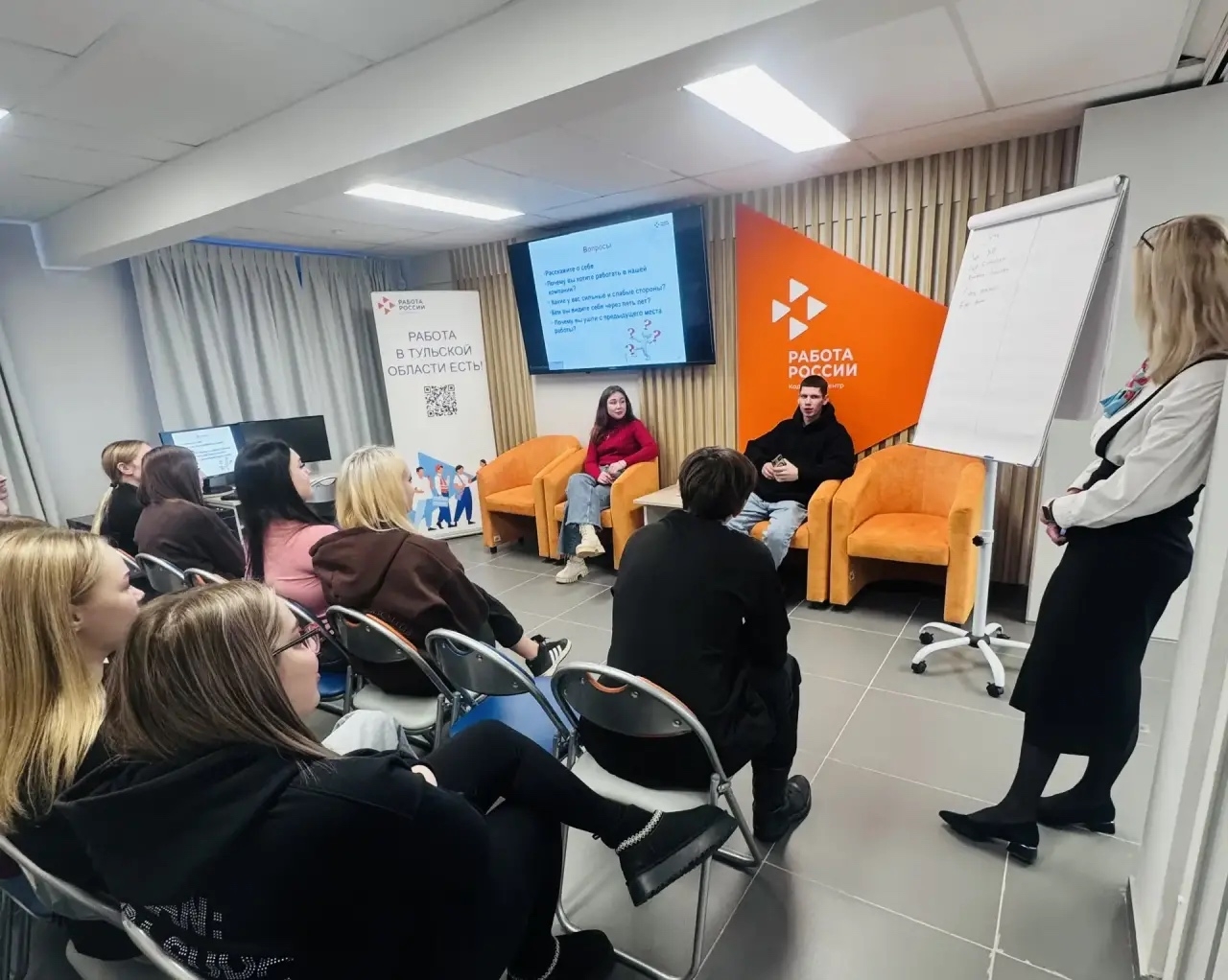 В ходе тренинга студенты познакомились с деятельностью кадрового центра, его задачами и направлениями работы, включая взаимодействие с работодателями, соискателями и образовательными организациями, а также посмотрели тематический фильм о работе службы. Отдельное внимание было уделено мерам государственной поддержки граждан, в том числе субсидиям для развития малого бизнеса и поддержке малоимущих жителей Тульской области.
