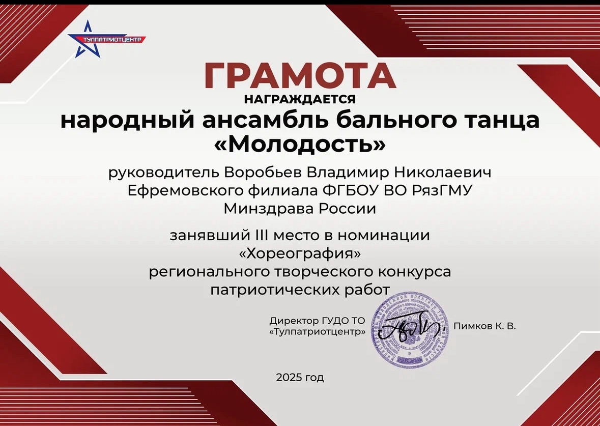 КОГДА ТВОРЧЕСТВО СТАНОВИТСЯ ХАРАКТЕРОМЕфремовский филиал РязГМУ с гордостью делится итогами регионального творческого конкурса патриотических работ «Тулпатриотцентр», который проводился Единым центром подготовки граждан к военной службе и военно-патриотического воспитания молодежи Тульской области в сентябре–октябре 2025 года. | ||