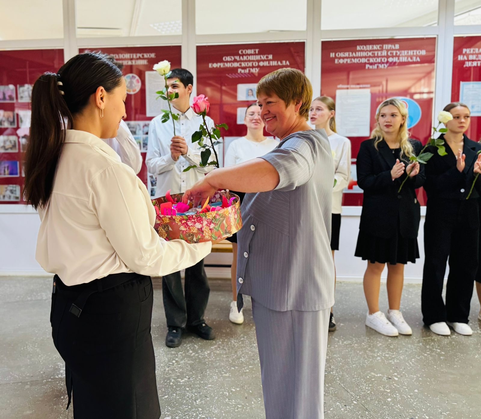 Музыкальные номера и слова благодарности стали настоящим подарком для виновников торжества на большой перемене в холле первого этажа. Этот день еще раз напомнил: преподавание не просто работа. Это выбор, которому остаются верны. И в стенах Ефремовского филиала работают именно такие люди — увлеченные, искренние, преданные своему делу.