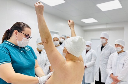 Особую ценность встрече придало то, что сама пациентка лично присутствовала на занятии, поделилась своей историей, переживаниями и опытом восстановления. По ее добровольному согласию врач провела демонстрацию техники пальпации молочных желез и лимфатических узлов — методов, имеющих первостепенное значение в раннем выявлении онкологических заболеваний.