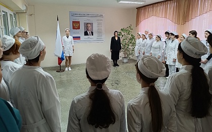 По традиции, мероприятие открылось подъёмом Государственного флага Российской Федерации — символа национального единства, чести и достоинства. Почётное право поднять флаг было предоставлено студентке 3 курса специальности «Сестринское дело» Екатерине Цымбал.