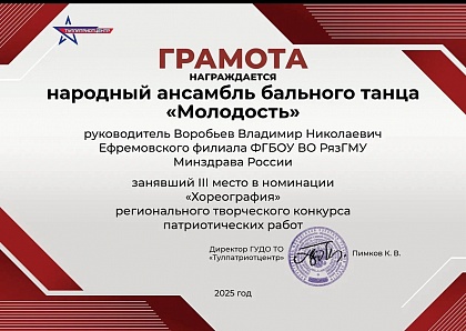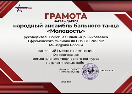 Ефремовский филиал РязГМУ с гордостью делится итогами регионального творческого конкурса патриотических работ «Тулпатриотцентр», который проводился Единым центром подготовки граждан к военной службе и военно-патриотического воспитания молодежи Тульской области в сентябре–октябре 2025 года.