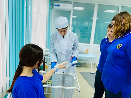 Площадка направления «Сестринское дело» позволила участникам погрузиться в рабочую атмосферу медицинского кабинета. Старшеклассники попробовали выполнить ключевые манипуляции, требующие аккуратности и концентрации: