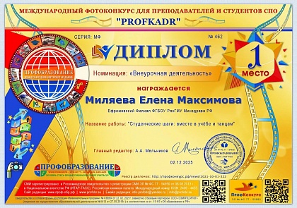 Композиционная выразительность, техническая точность и искреннее эмоциональное наполнение сделали ее работу по-настоящему яркой и в итоге принесли первое место в номинации. Эта победа — результат упорства, внимательной работы над деталями и искренней любви Елены к творчеству. На протяжении всех лет обучения она является постоянной солисткой народного ансамбля бального танца «Молодость» нашего филиала, и ее успех на международной площадке еще раз подтверждает, что профессиональное образование и творческое развитие могут идти рука об руку.