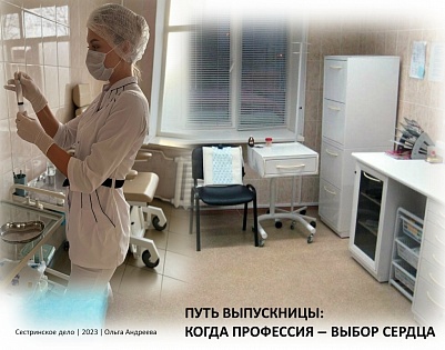 Андреева Ольга — выпускница 2023 года специальности «Сестринское дело». Сегодня Ольга работает палатной медицинской сестрой в терапевтическом отделении ГУЗ «Ефремовская районная клиническая больница имени А.И. Козлова». Работа медицинской сестры всегда больше, чем должностная инструкция. Это внимательность к деталям, умение действовать быстро и точно, поддержка пациентов и их близких.