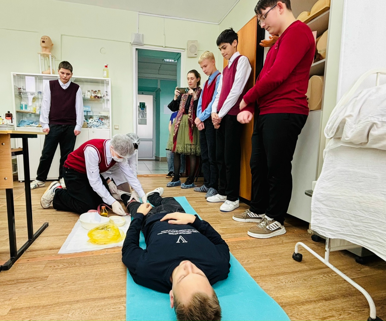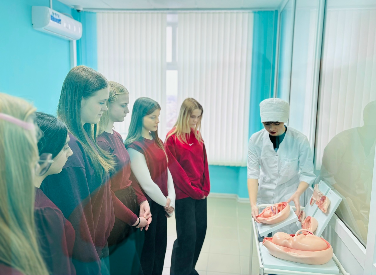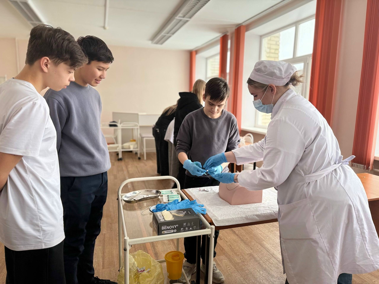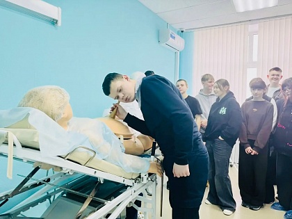 Знакомство традиционно началось с интерактивных зон в фойе первого этажа. Под руководством лаборанта симуляционного кабинета Г.А. Мишкиной ребята осваивали базовые медицинские навыки: элементы сердечно-легочной реанимации, технику наложения повязок и выполнение внутримышечных инъекций на тренажерах. Практика, которая помогает понять главное: медицина требует точности, ответственности и уверенности в действиях. Далее школьники посетили профориентационные площадки филиала.