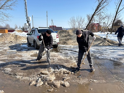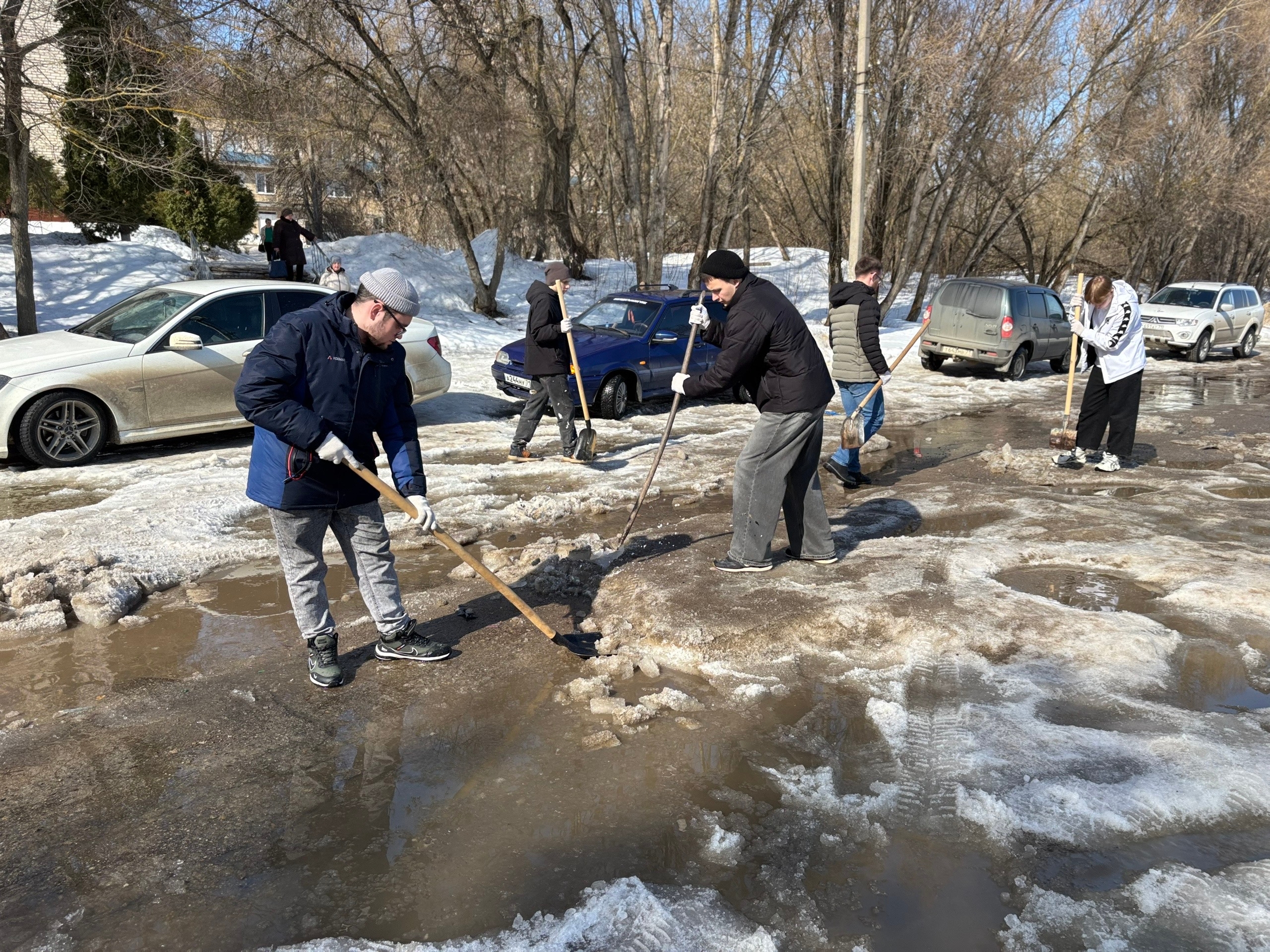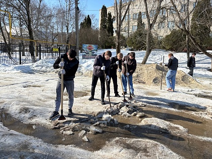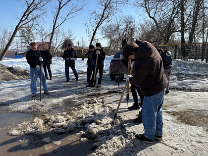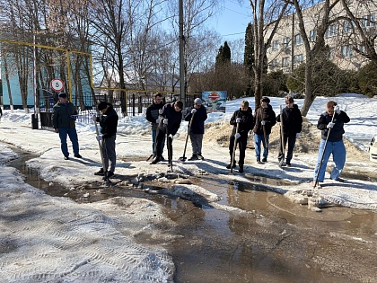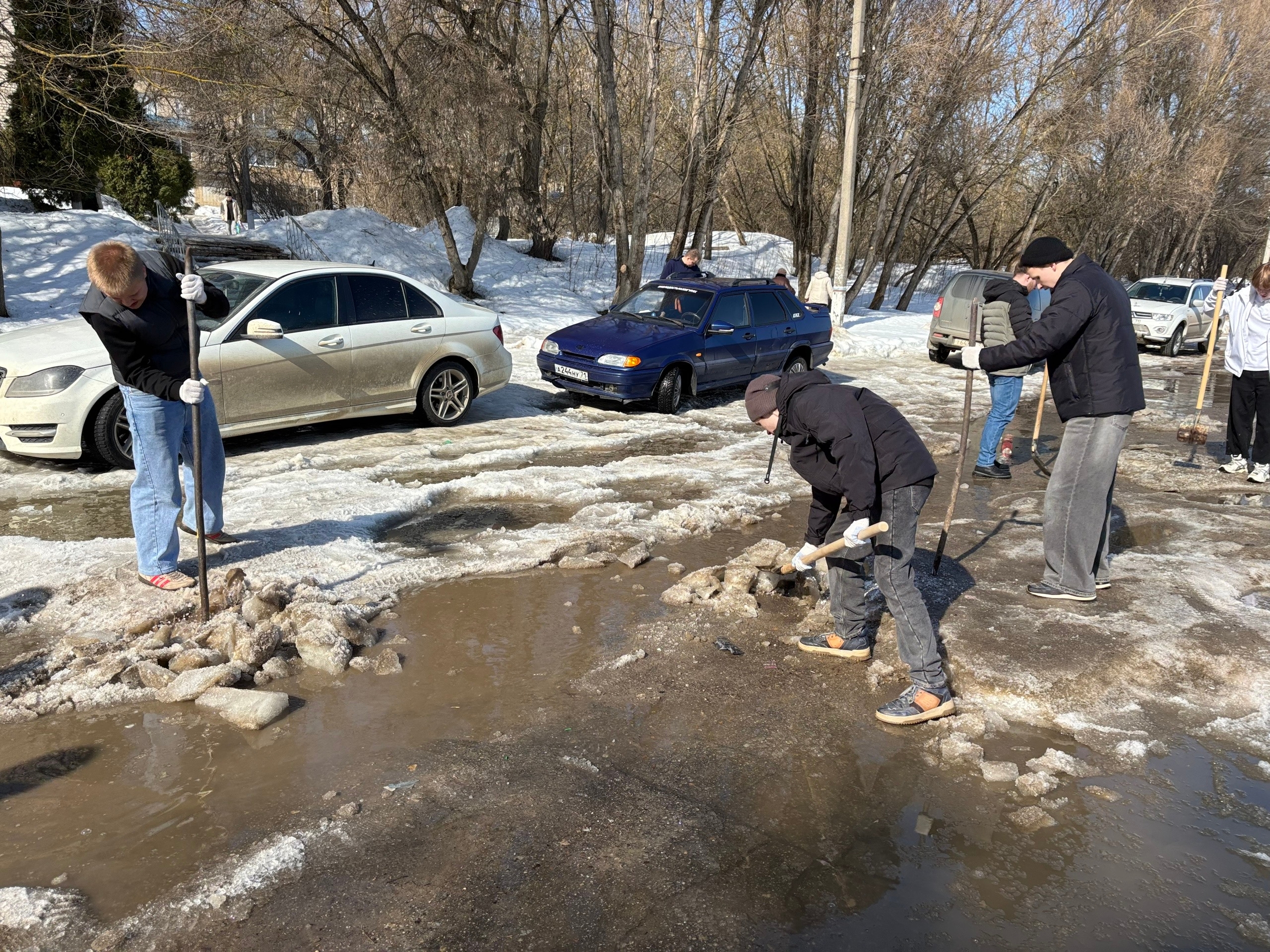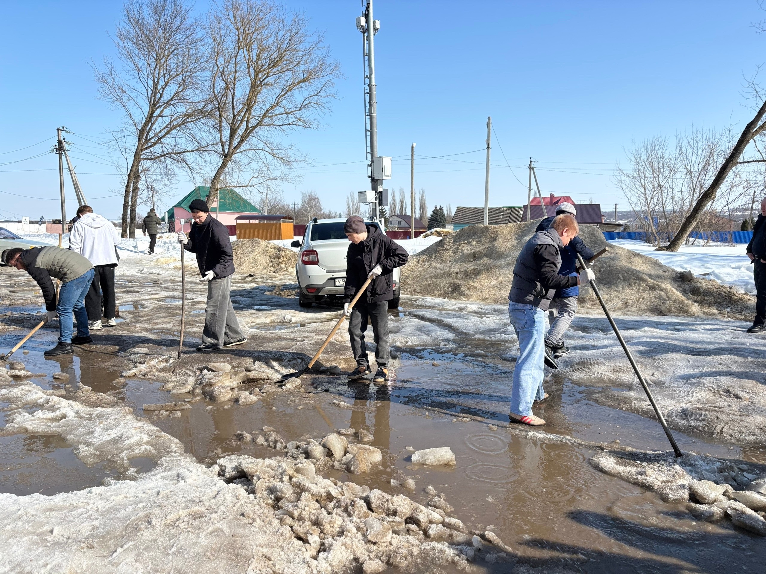 На помощь пришли студенты 3 курса технической специальности. Под руководством начальника отдела безопасности и контроля Д.В. Полковникова и начальника хозяйственного отдела В.Ю. Новикова юноши вооружились ломами и взялись за непростую работу. Шаг за шагом они разбивали лёд, выравнивая проезд. В результате дорога была очищена практически до асфальта, а ледяные осколки аккуратно сложены вдоль дороги.