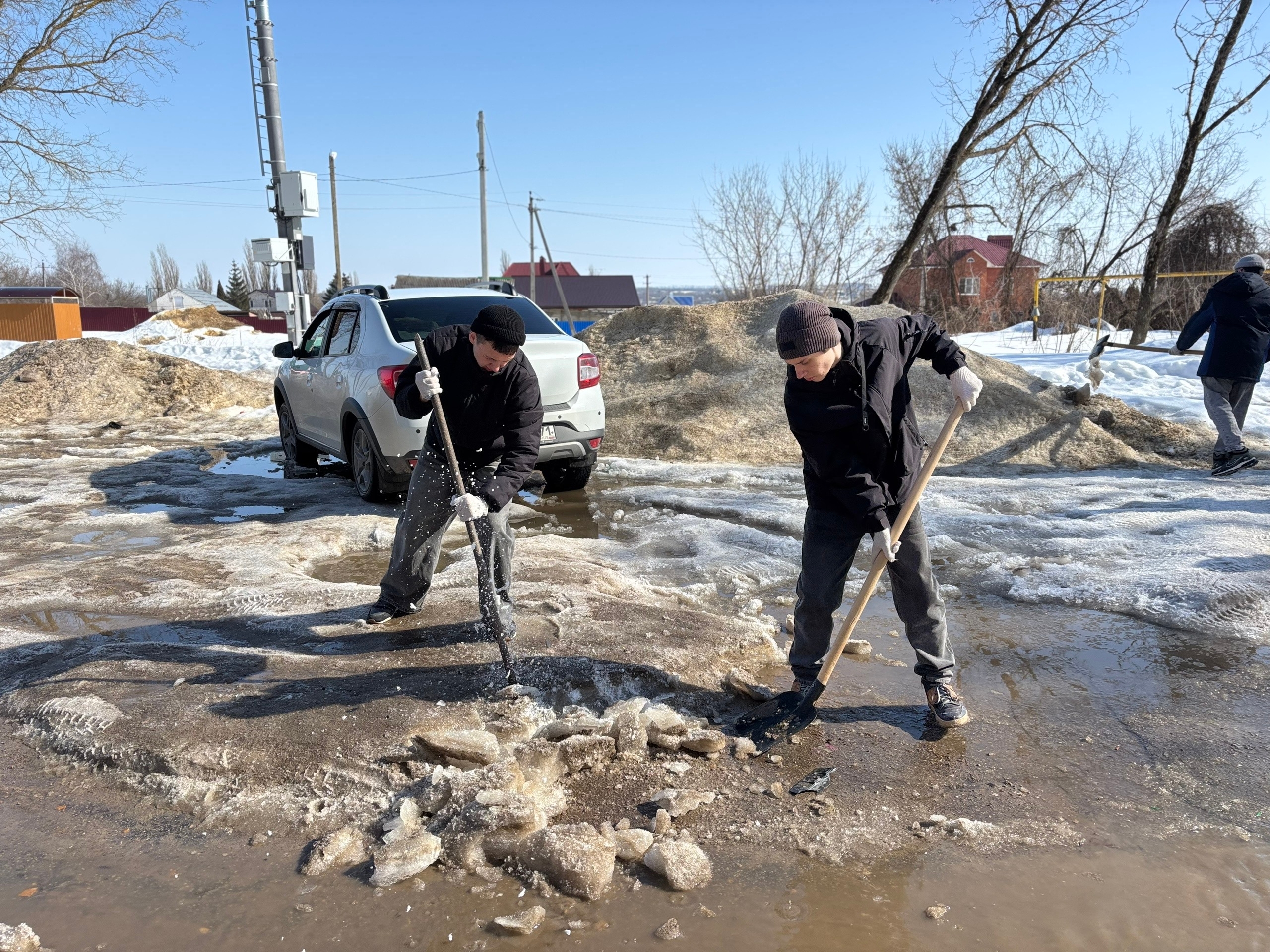 На помощь пришли студенты 3 курса технической специальности. Под руководством начальника отдела безопасности и контроля Д.В. Полковникова и начальника хозяйственного отдела В.Ю. Новикова юноши вооружились ломами и взялись за непростую работу. Шаг за шагом они разбивали лёд, выравнивая проезд. В результате дорога была очищена практически до асфальта, а ледяные осколки аккуратно сложены вдоль дороги.
