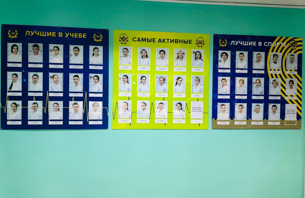 В этом месяце мы обновили стенд с фотографиями наших студентов: лучших в учебе, самых активных и победителей в спорте. Эти ребята — настоящие вдохновители для всех нас, ведь их успехи говорят сами за себя.