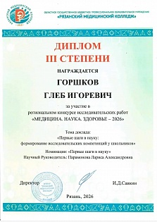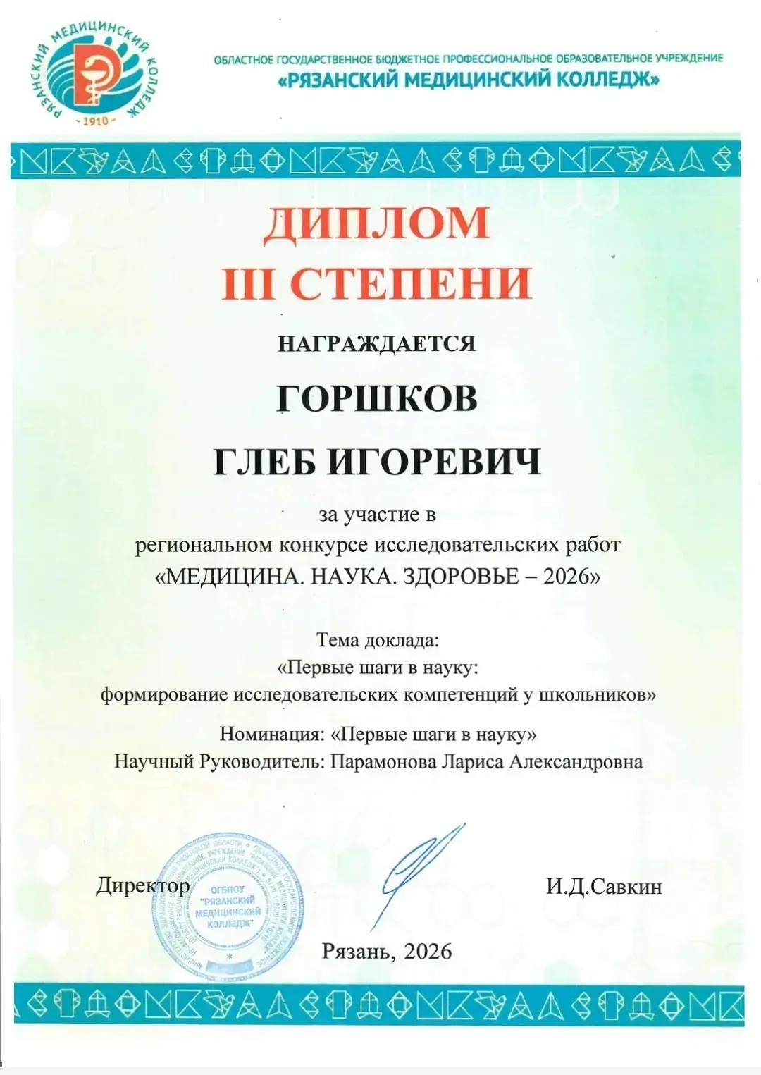 ☆ Горшков Глеб – диплом III степени (научный руководитель – Парамонова Л.А.)