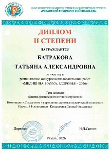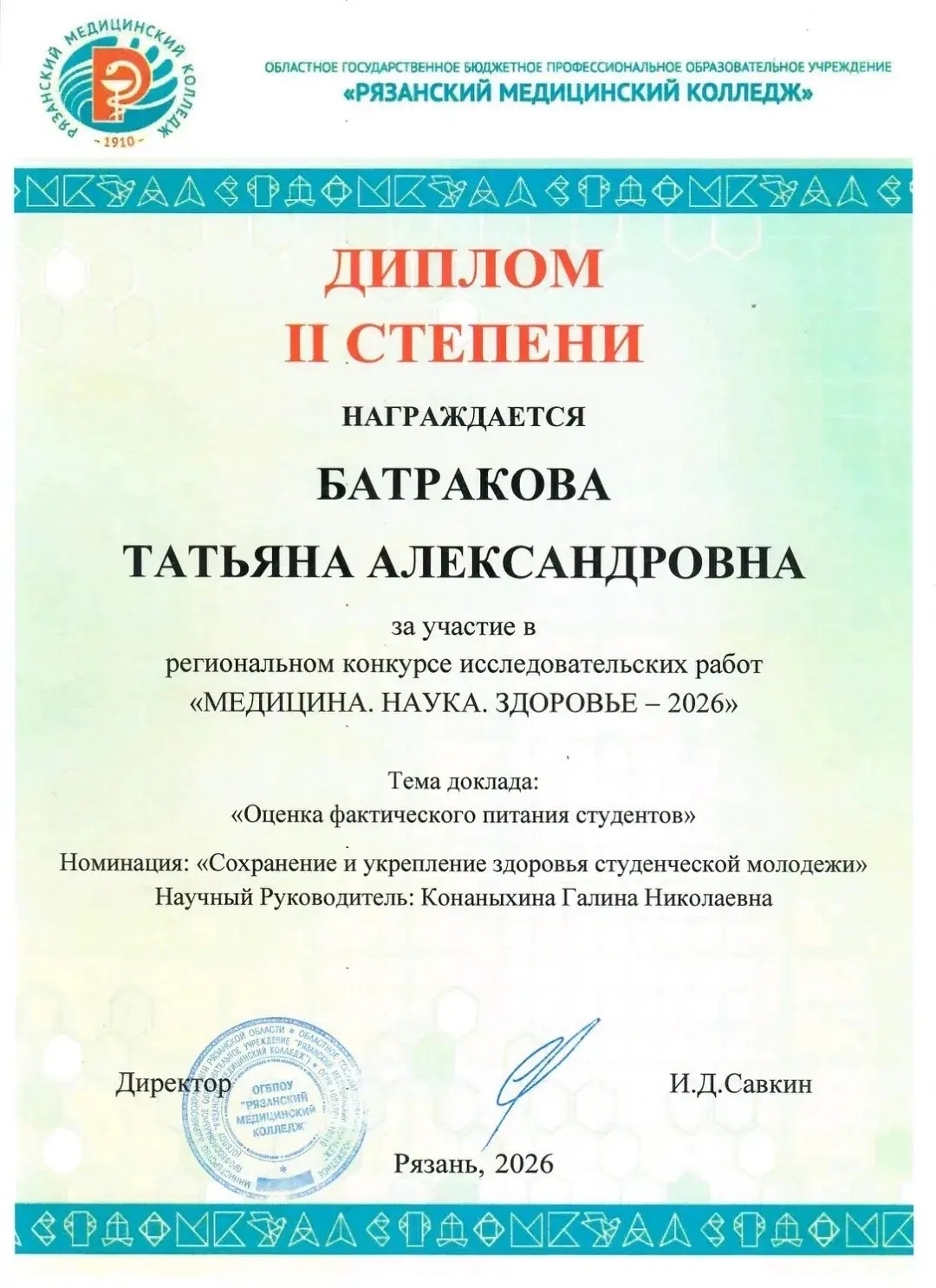 Гордимся успехами наших студентов в региональном конкурсе исследовательских работ, посвященном Дню российской науки «Наука. Медицина. Здоровье – 2026», организованном Рязанским медицинским колледжем.