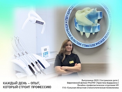 Сейчас Кристина работает медицинской сестрой лечебно-профилактического отделения №1 Тульская областная стоматологическая поликлиника», где каждый день приносит новые задачи и возможность помогать людям.